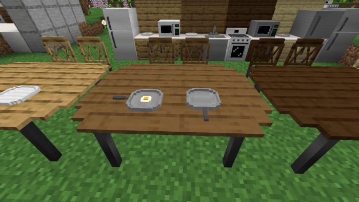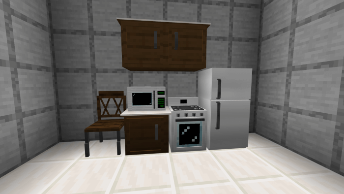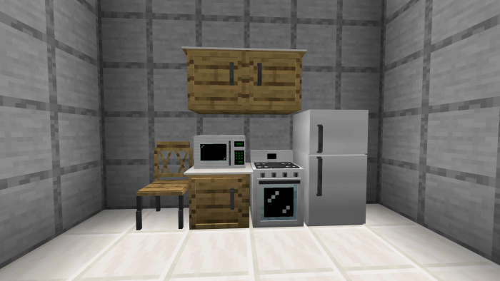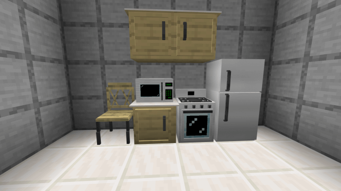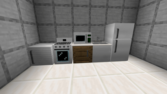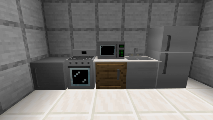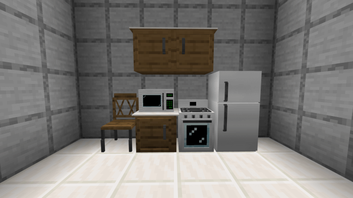 3D Kitchen Furniture Addon - content modification that adds to Minecraft a whole collection of decorative items that can diversify the appearance of pixel kitchen and virtual dining room.