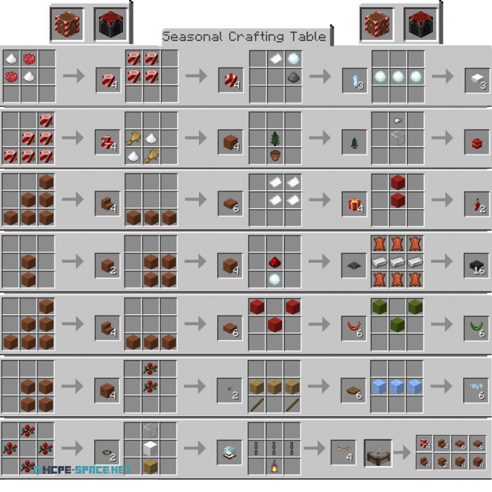 All items in this add-on can be obtained in one of three ways. The first, and easiest way, is to use the Spawn All Items item, which is located in the creator's inventory. Using this item puts two barrels in front of the player, which contain absolutely all the items from the addon. The following two methods can be used in survival. The player can buy addon items from a seasonal merchant or craft them at a seasonal workbench.