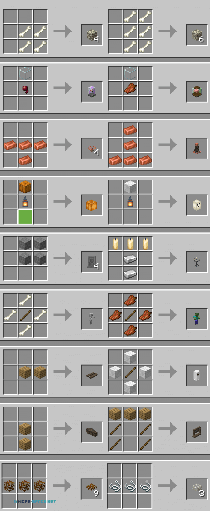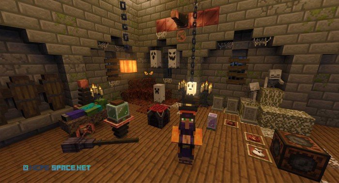 - Jack O Lantern: a small jumping pumpkin that follows the player and emits light. Their color can be changed with dye, and their faces can be changed with scissors.