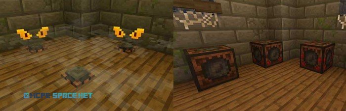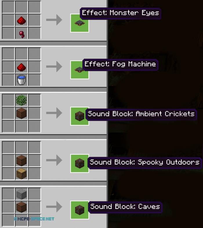 Effect blocks and sound blocks have recently been added to the addon. These are switchable blocks that, as the name suggests, create sounds and particle effects at their location. When you interact with them, you can cycle through their different states to achieve the desired effect. Both types of blocks are great for creating an eerie atmosphere in a building.