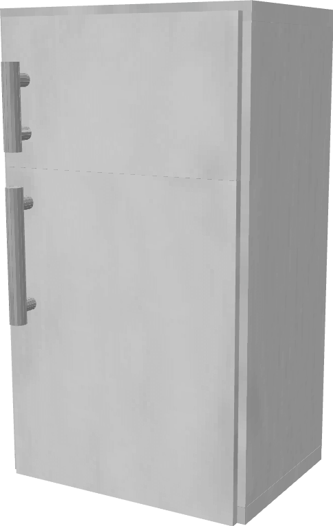 Double-door refrigerator with freezer and standard compartments, available in gray coloring. The appliances are built in and available for interaction - the doors open and display the contents.