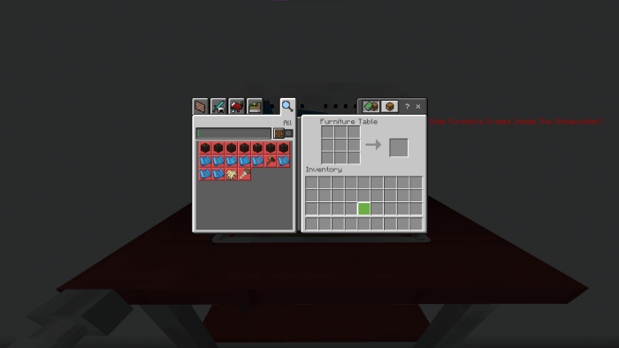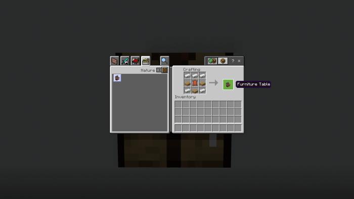 If in "Creativity" furniture in the ready-made form is selected in the inventory, then in "Survival" can not do without a furniture workbench (work table is assembled from leather, 5 iron ingots and 3 wooden half-blocks) and a whole set of recipes.
