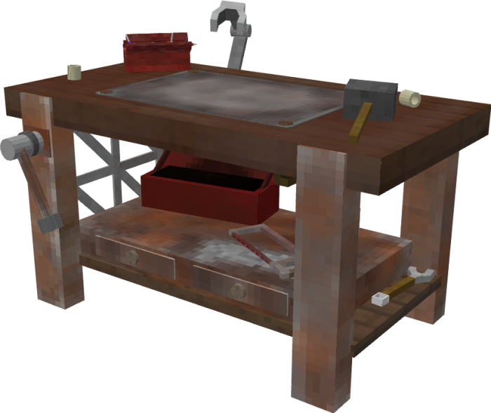 The wooden workbench, littered with carpentry tools and blueprints, is used in the Weapons and Survival Tools expansion as a complete workstation for the manufacture of new equipment.