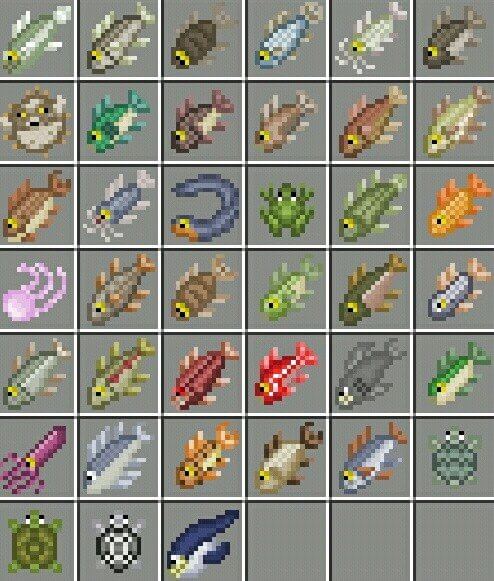 The modification includes over 35 new inhabitants of the virtual seas and oceans (not counting fish already available in Minecraft, such as cod and salmon): the collection includes freshwater perch, turtles, eels and frogs.