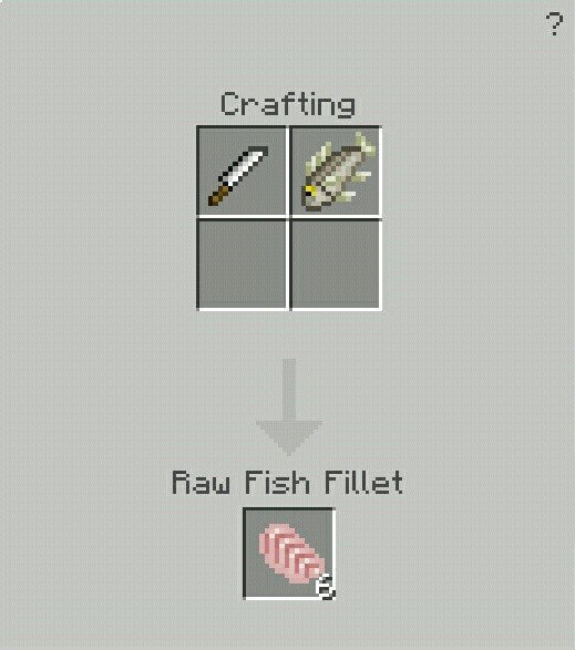 Thinly sliced fish fillets fill one and a half hearts on the hunger scale and can be made from any fish. The number of pieces added to the inventory depends on the size of each carcass caught. Small fish are cut into 1 or 2 fillets, while large fish are cut into 7 to 14 fillets.