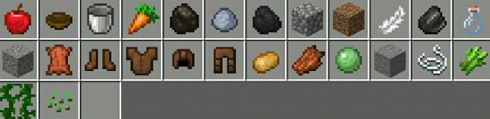 A standard container holding both waste (cobblestones, soil, seeds) and useful items such as armor, feathers and gunpowder.